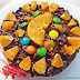 - Once both cake and the chocolate topping cool down. Now place the cake on a serving plate. Spread the chocolate topping well on the top of the cake. Now garnish with orange wedges and cadbury gems.